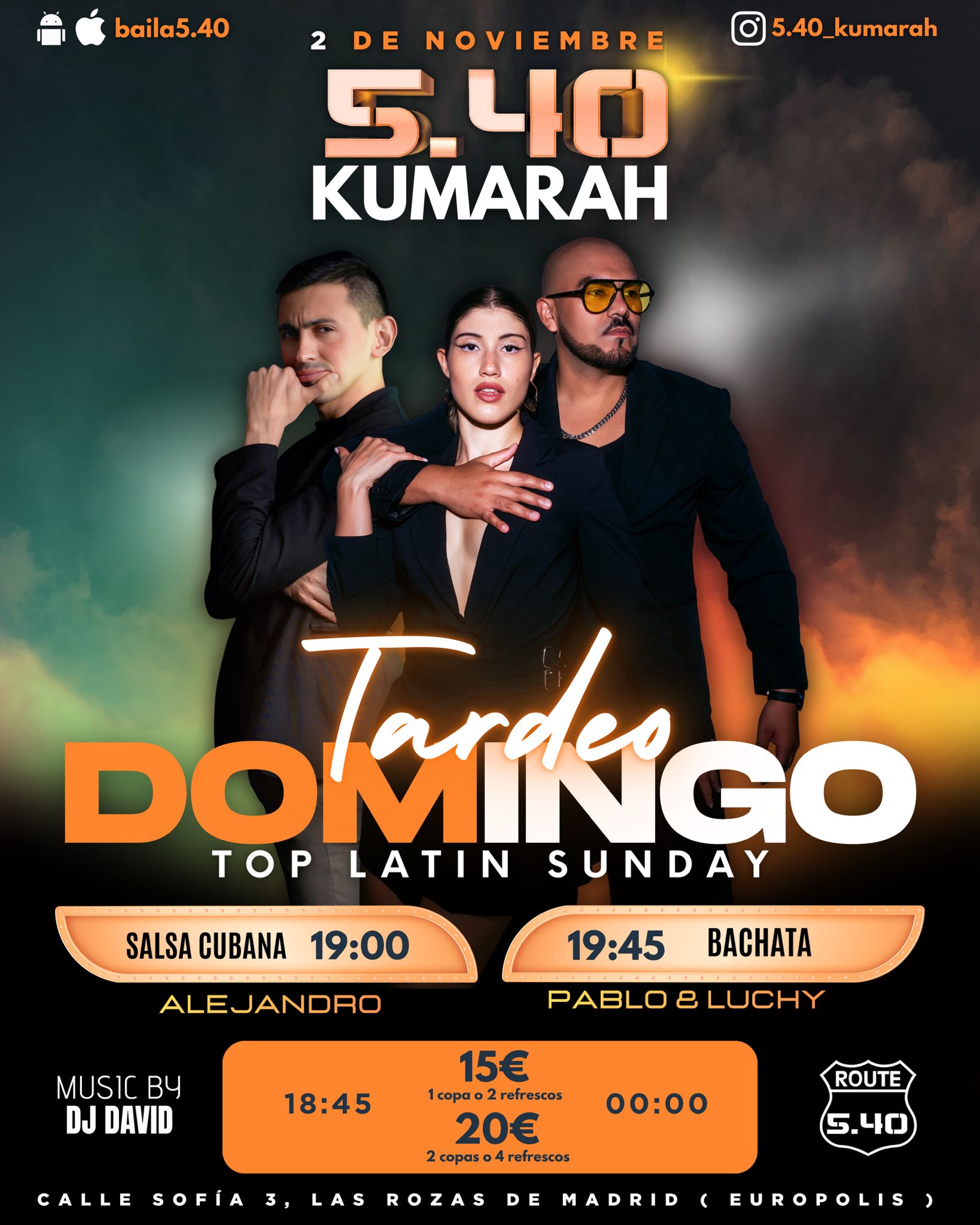 Los domingos se viven a otro nivel en 5.40 Kumarah. Si te apasiona el baile y buscas un plan diferente para cerrar la semana, nuestro tardeo latino es tu cita imprescindible. Disfruta de talleres de salsa, bachata y kizomba impartidos por profesores de calidad, pensados para todos los niveles, desde principiantes hasta avanzados.